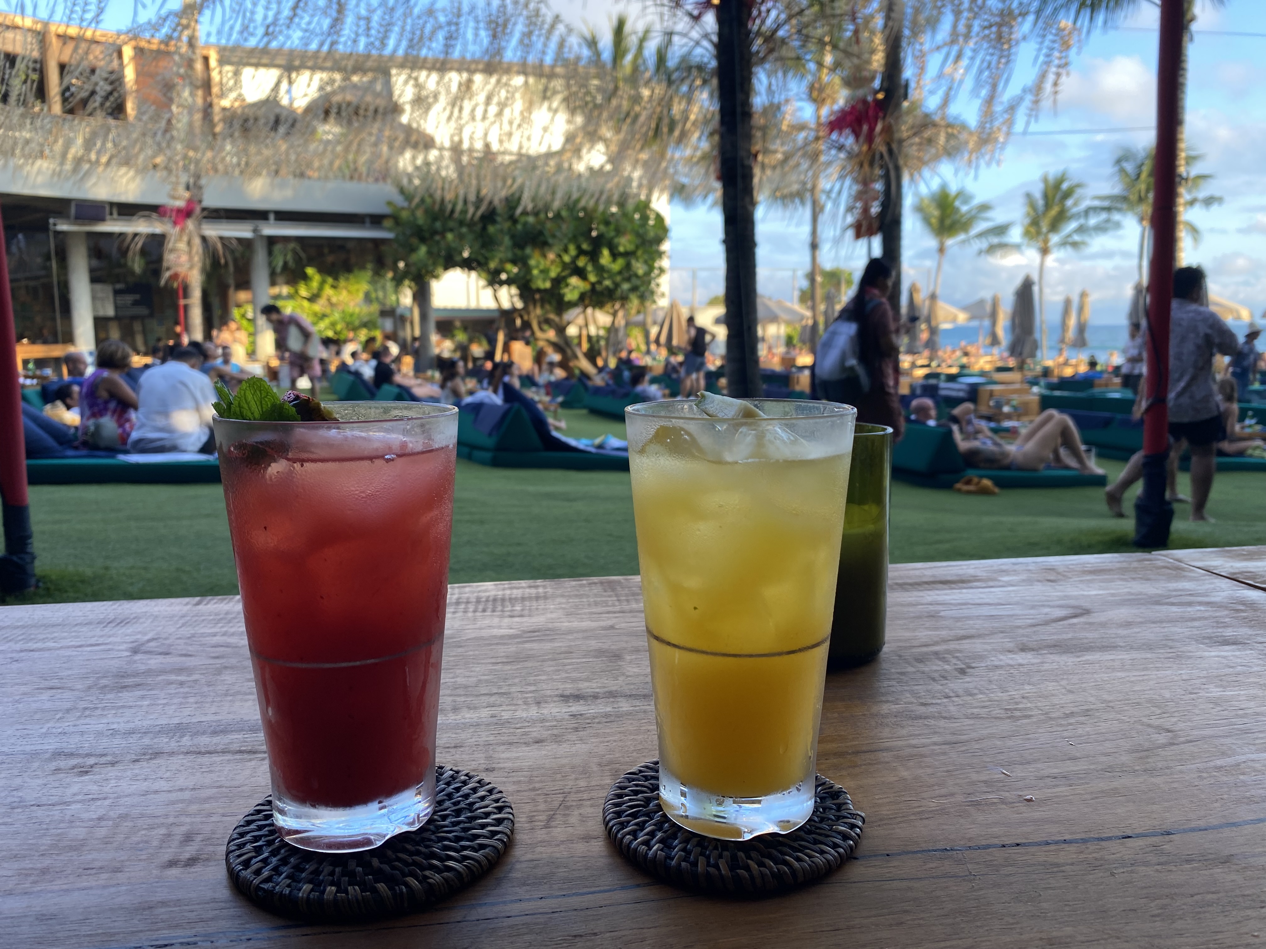 워낙에 인기가 많은 곳이라 베드나 바다 바로 앞 테이블을 원한다면 미리 예약을 하고 방문하는 것이 좋습니다. 위치에 따라 미니멈으로 페이를 해야 하는 금액이 다른데 만약 시간 여유가 많다면 하루 정도 머물며 즐기는 것을 추천드리고 싶습니다. 저희의 경우 예약 없이 해지기 30분 전 도착 방문했고 입구에서 약 15분 대기 후 입장할 수 있었습니다. (따로 입장료는 없습니다.) 좋은 자리는 아니었지만 2층 테이블에 앉아 음료를 즐기고 둘러보며 멋진 석양까지!! 몽환적인 분위기와 음악에 매료되어 다음 발리 방문하면 꼭 하루 종일 이곳을 누리며 수영하고 놀아야겠다 생각했습니다.