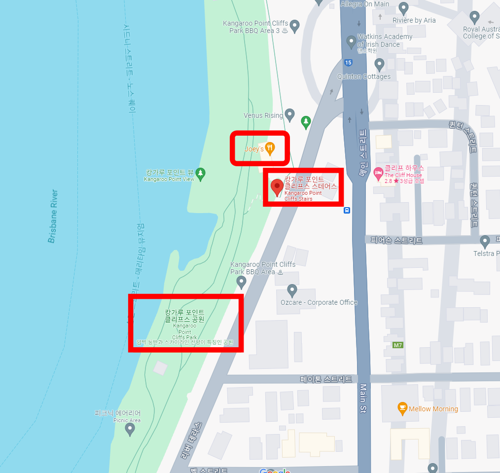 사우스 뱅크에서부터 혹은 선착장인 마리타임 역에서 오른쪽으로 산책하며 암벽 공원을 지나다 보면 캥거루포인트 암벽 계단을 만날 수 있는데요. 이 계단을 통해 Joey's 까페 및 전망대에 올라갈 수 있어요.