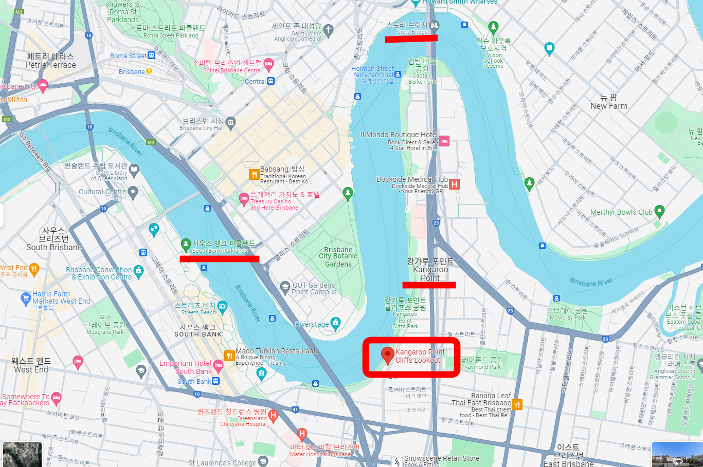 지도에서 보시는 것 같이 캥거루 포인트는 브리즈번 강변 남쪽에 위치하고 있어요. 유명한 사우스 뱅크 파클랜드에서 오른쪽 강변을 따라 쭉 걸어가면 30분 정도면 도착하며, 가장 가까운 페리 선착장은 Maritime Museum 역으로 정부에서 운영하는 무료 무료 페리인 시티호퍼를 통해 이동하실 수도 있습니다. (브리즈번 무료 페리 시티호퍼 정보는 지난 글을 참고해 주세요.)